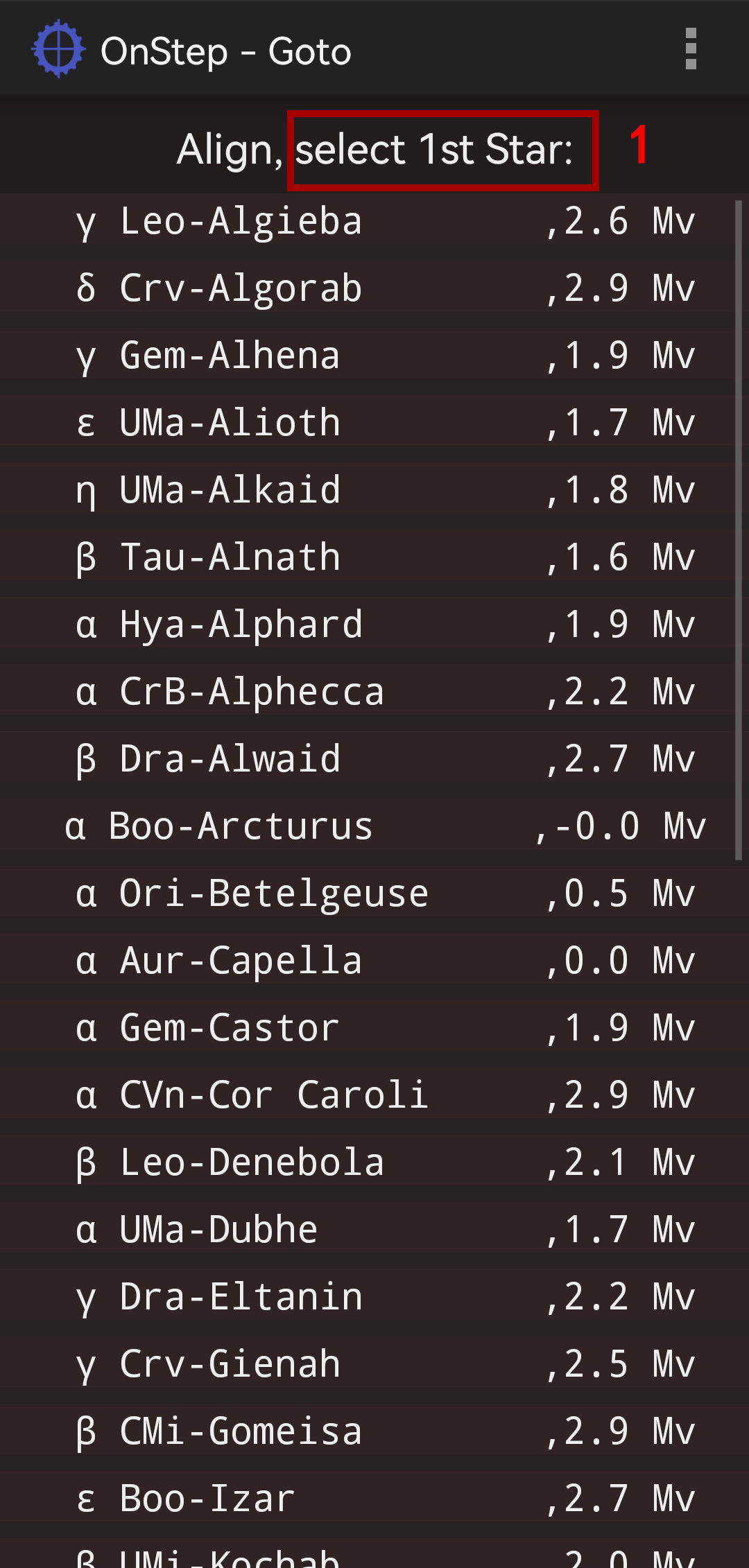此时你的ONSTEP已经完成初始化设定,可以在主菜单下方星表选择一个目标进行GOTO