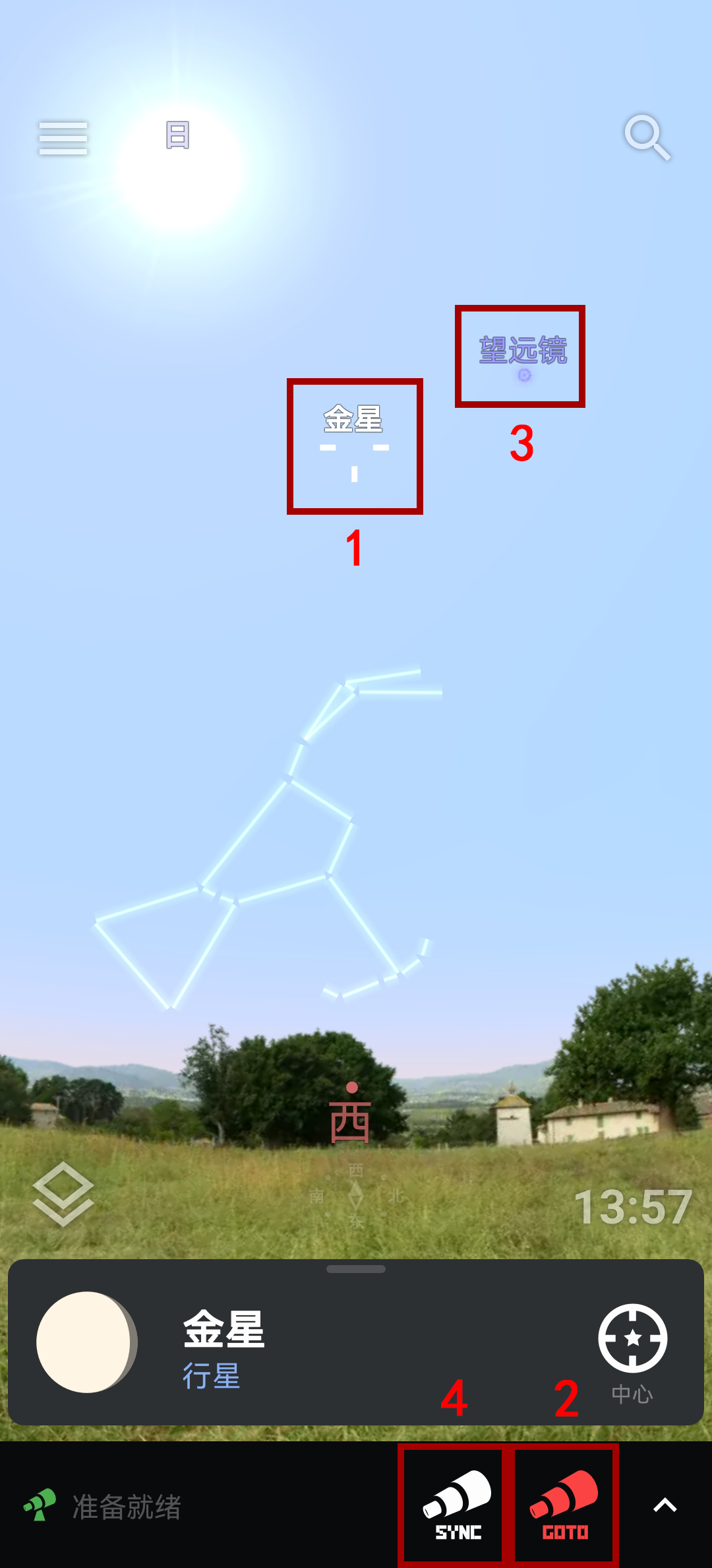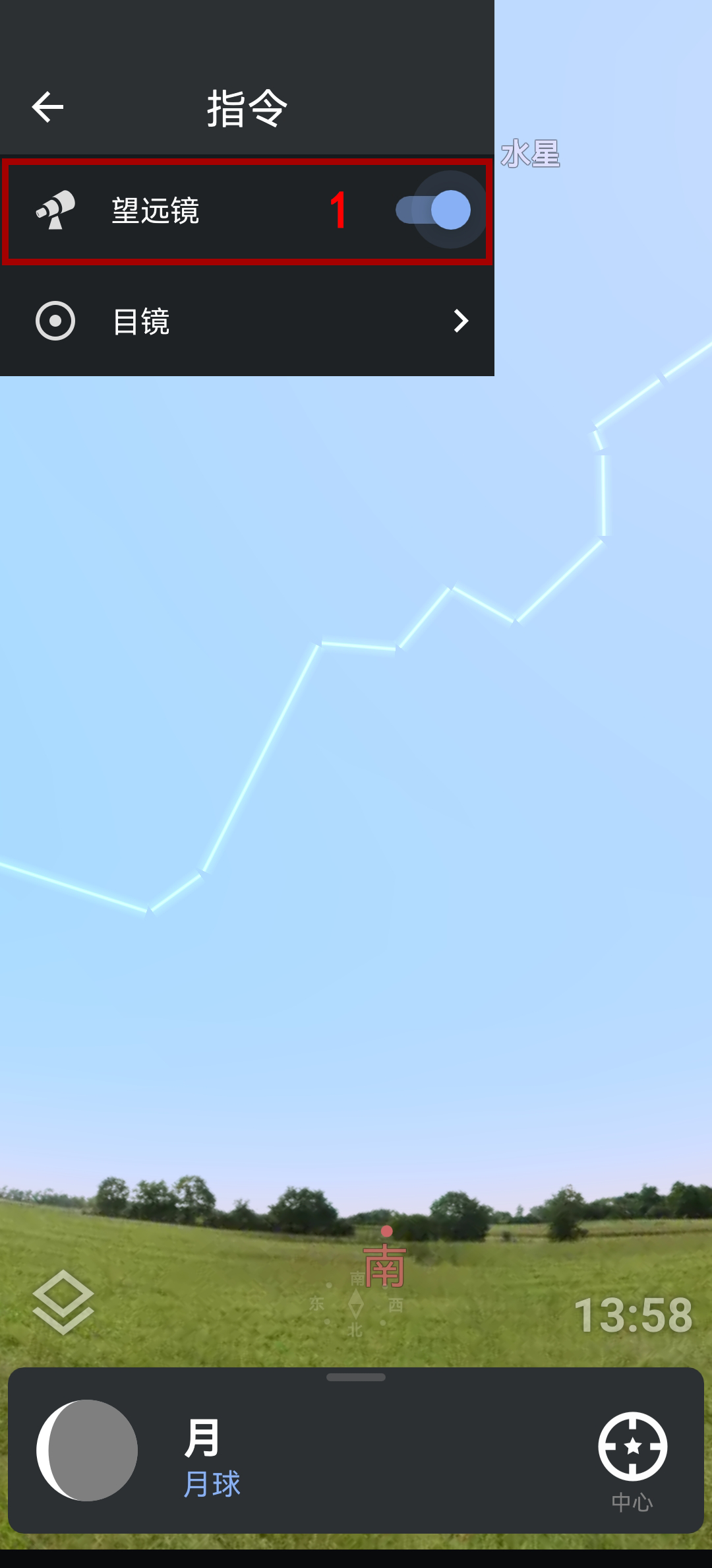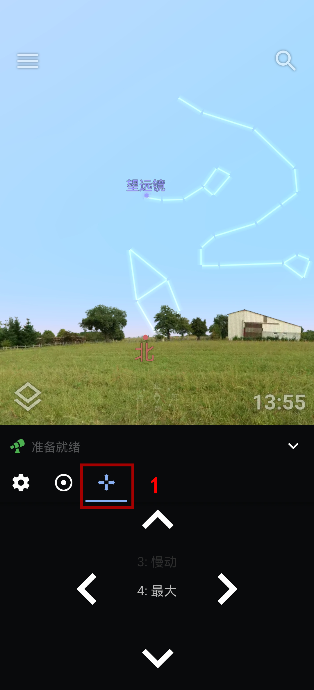 3.通过寻星镜或主镜观察目标是否在视场中间,如果不在,通过四个方向键将目标移动到视场中间