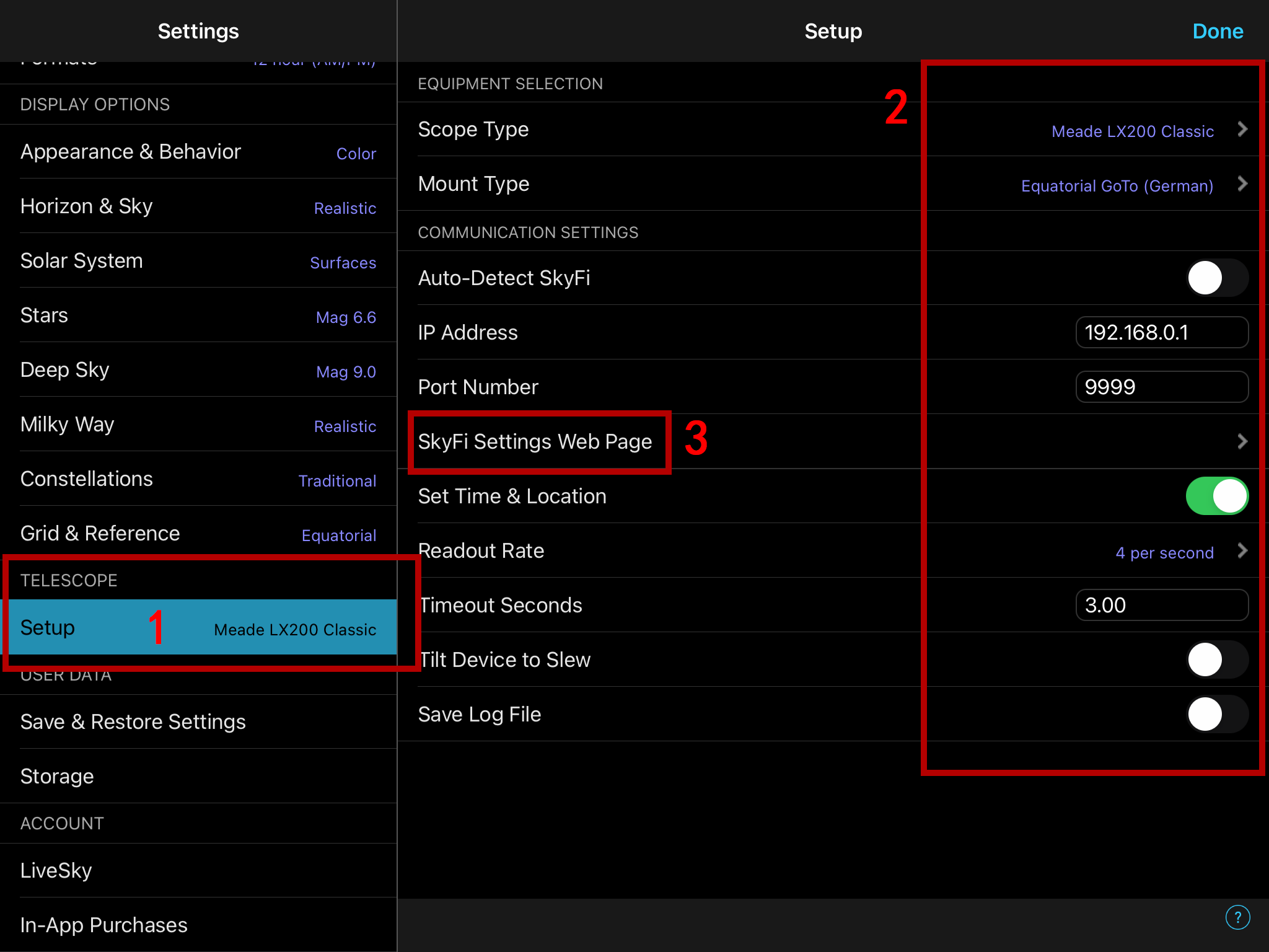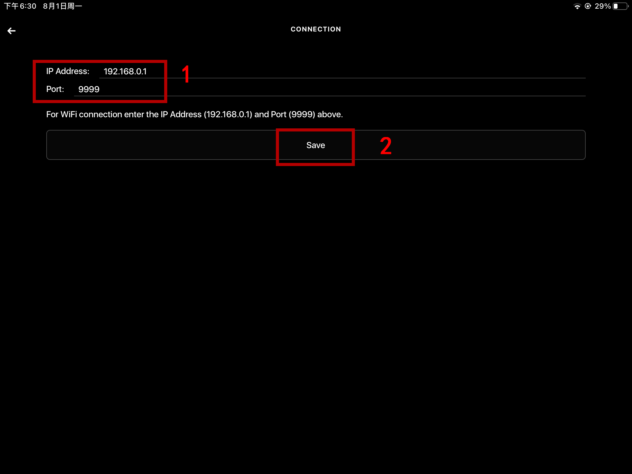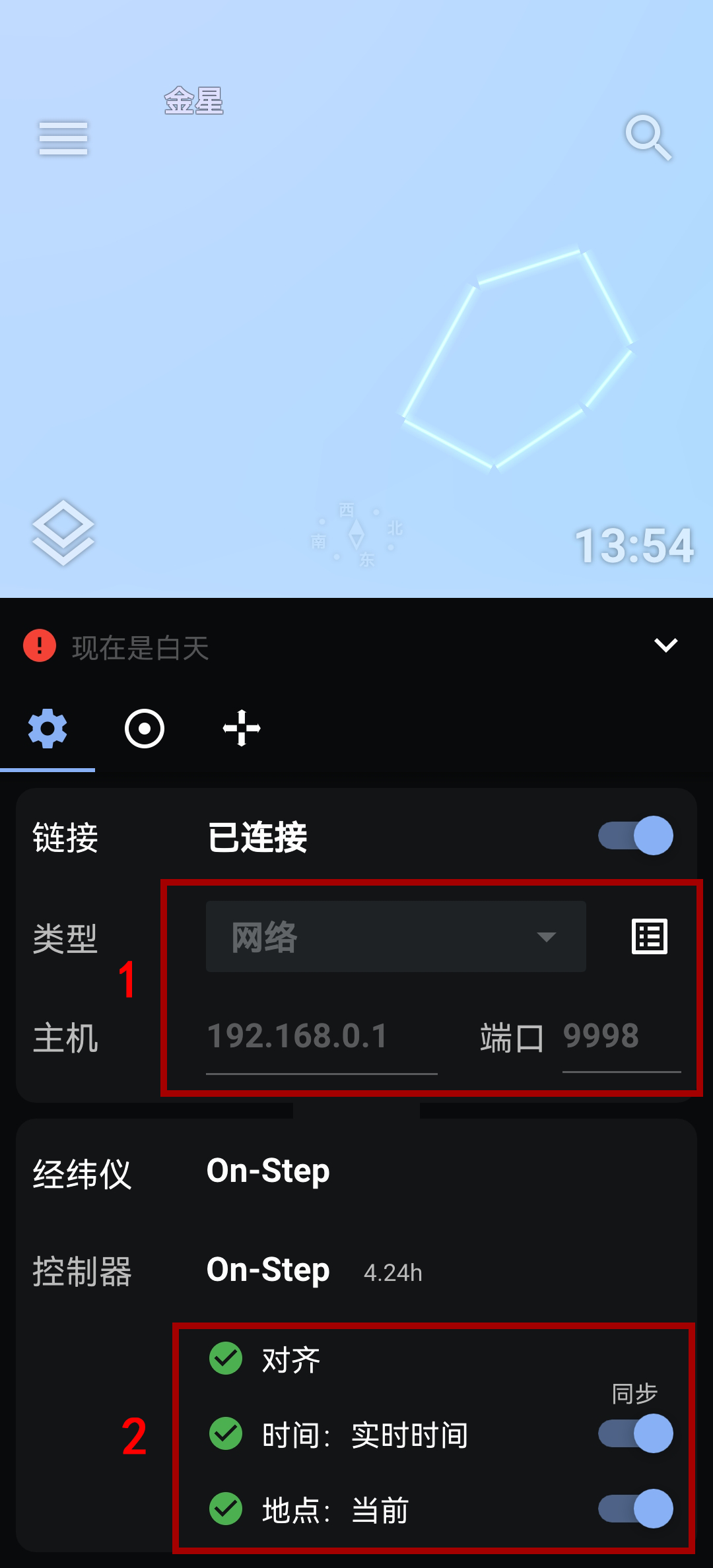 1.将手机连接到ONSTEP的WIFI热点,类型选择网络,IP地址和端口如图设定,必须完全一致