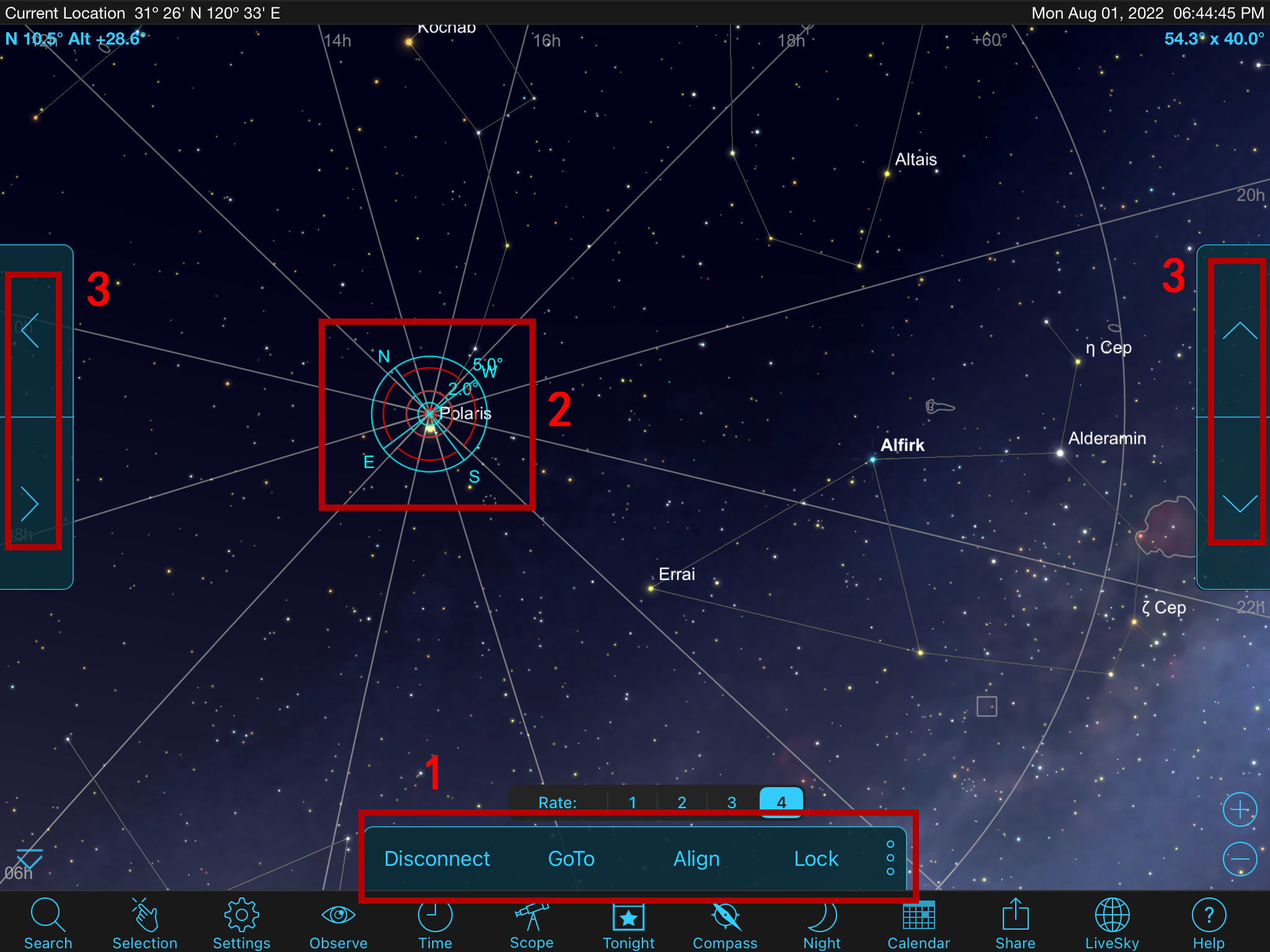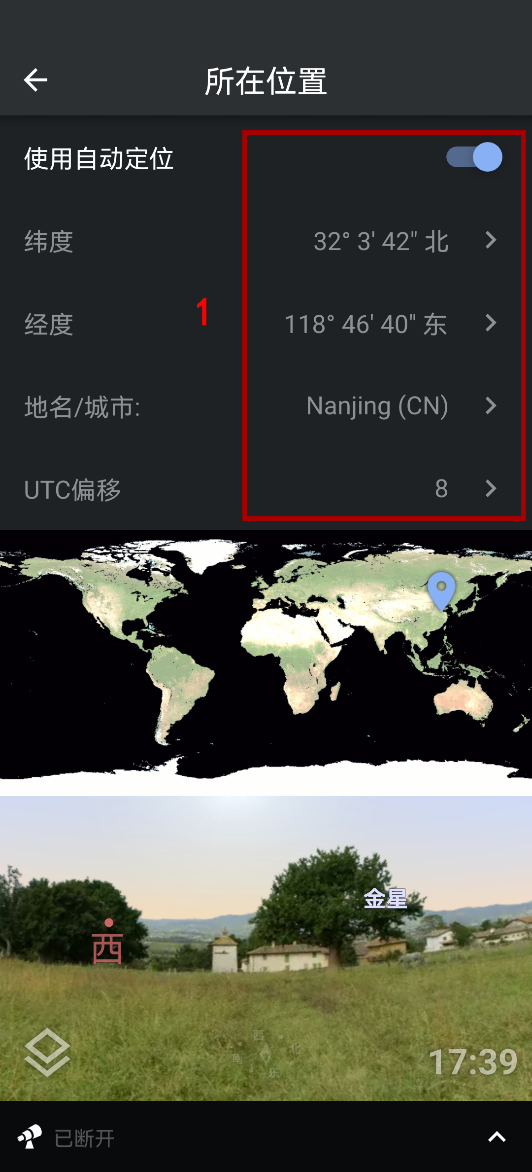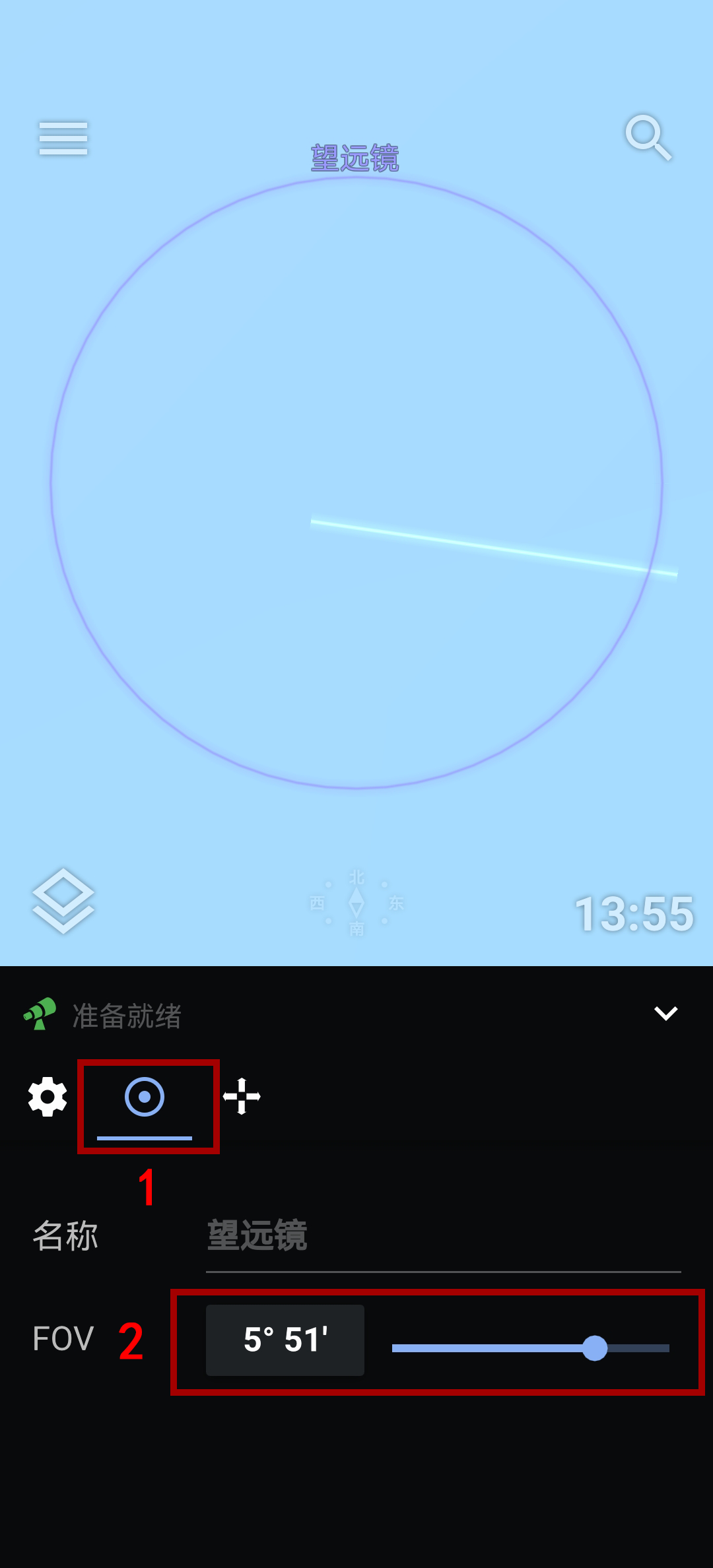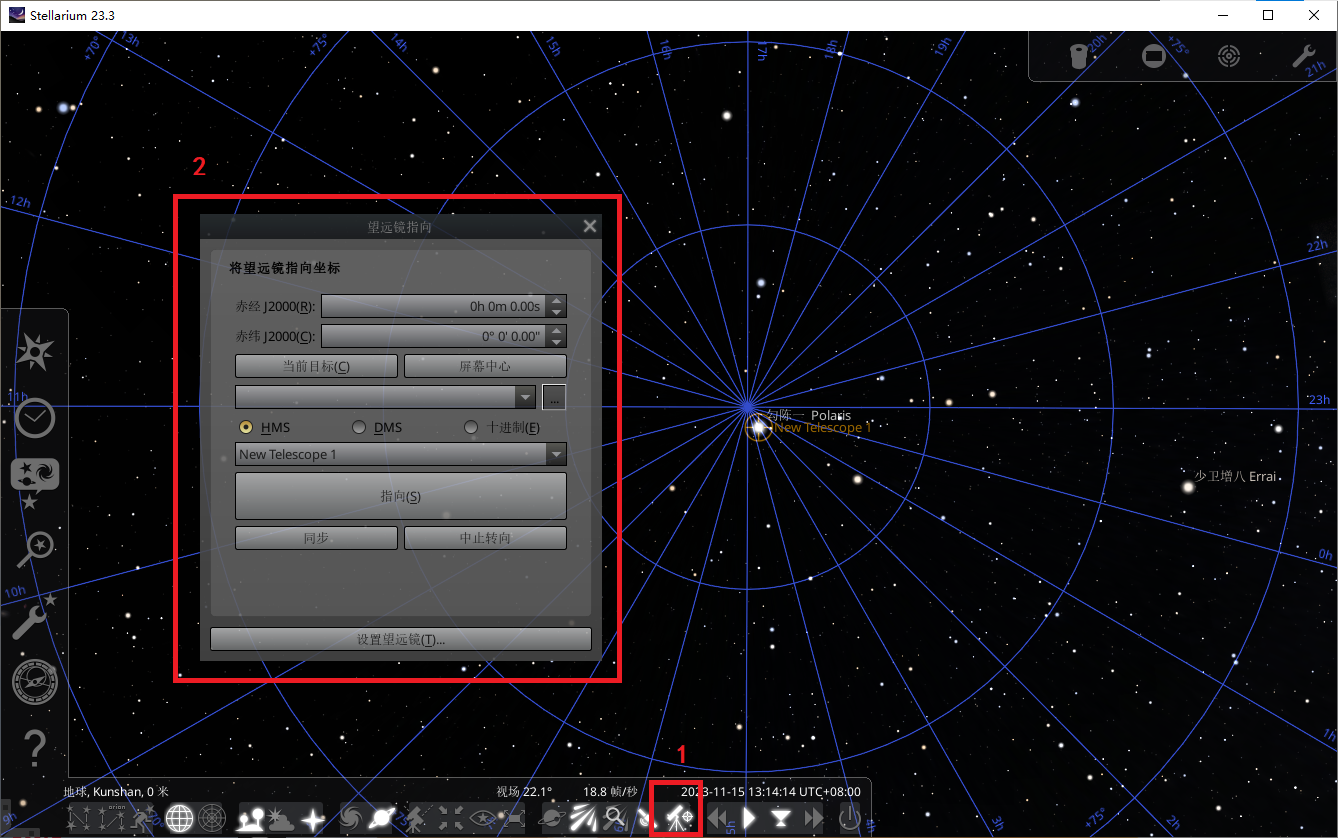 1.此时星图中会显示望远镜指向的圆圈图标。初始位置为北极星附近。