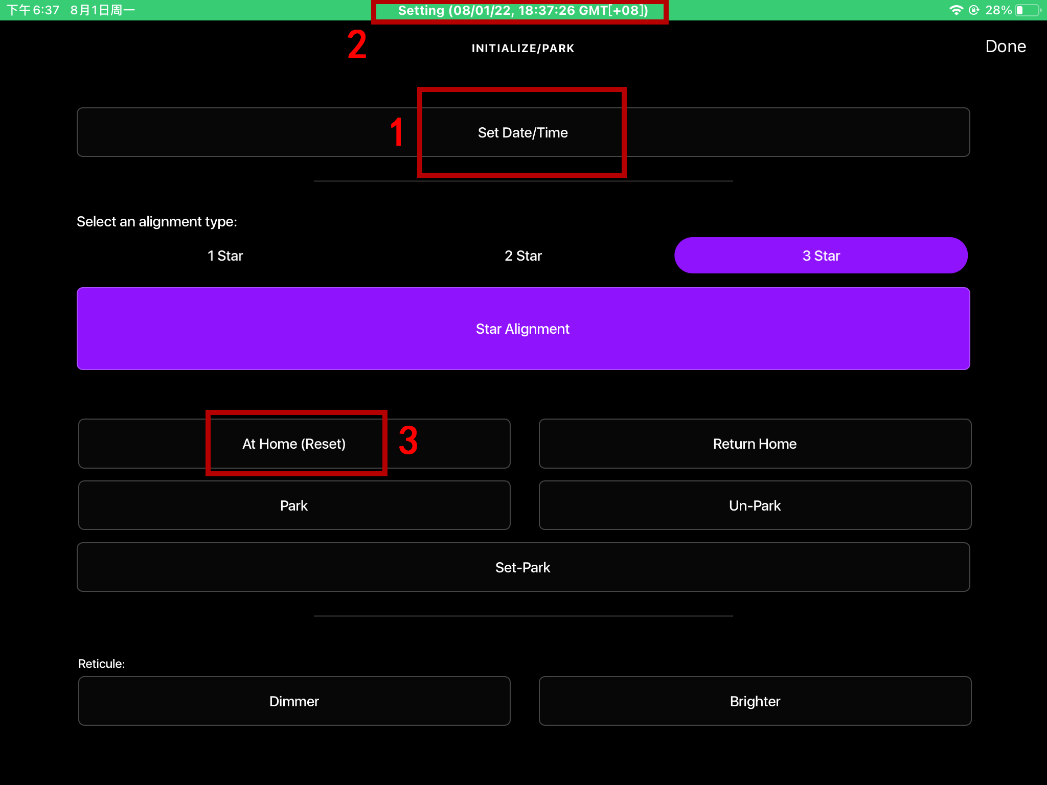 3.将望远镜手动对准北极点,点击At Home进行初始位置设定