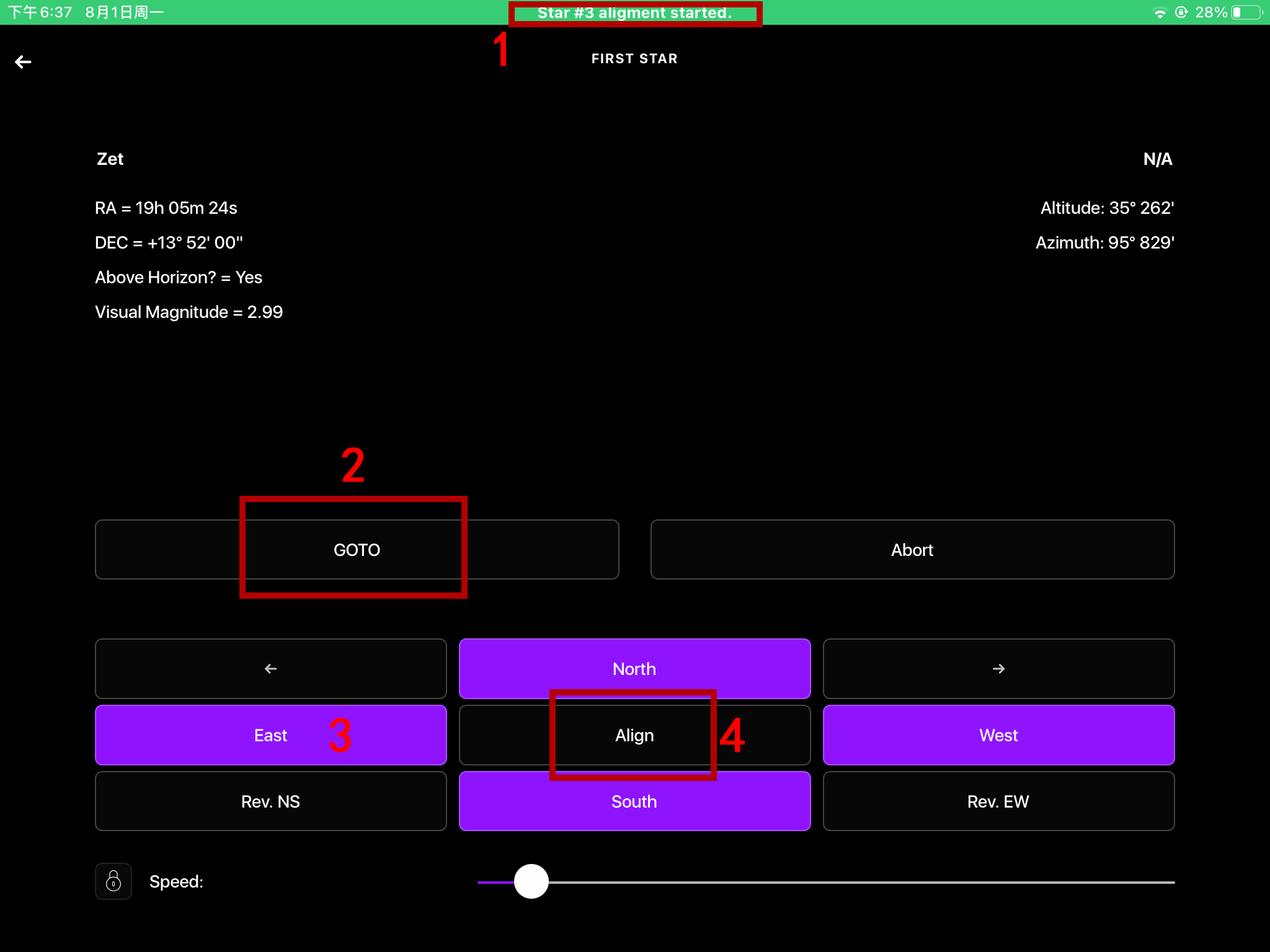 1.选择一个星点后,点击GOTO,此时赤道仪开始移动,等待赤道仪移动到位