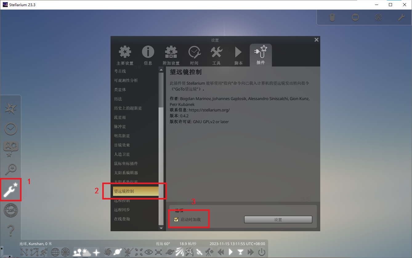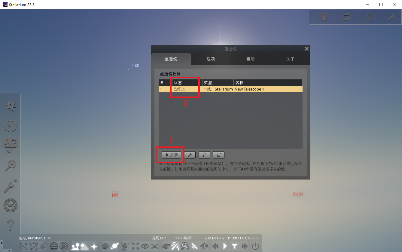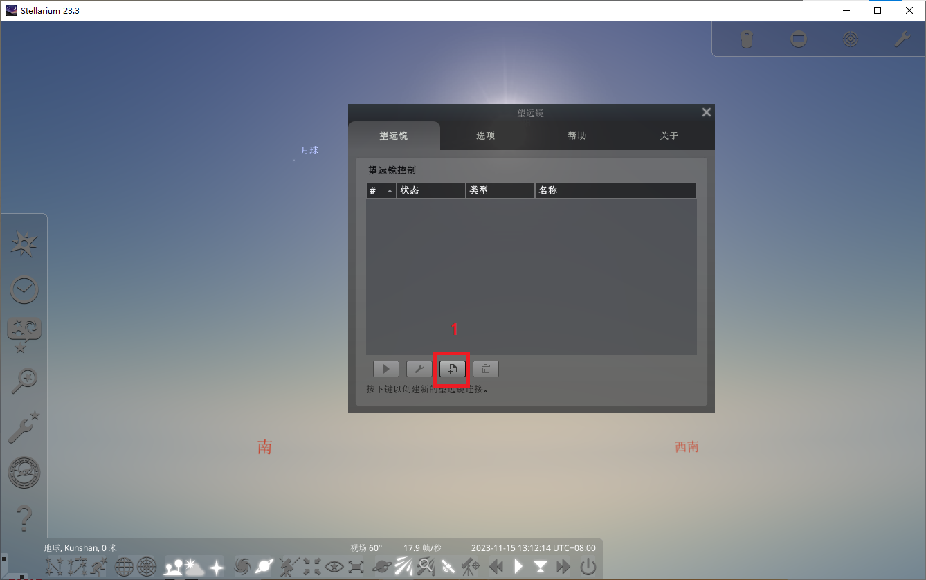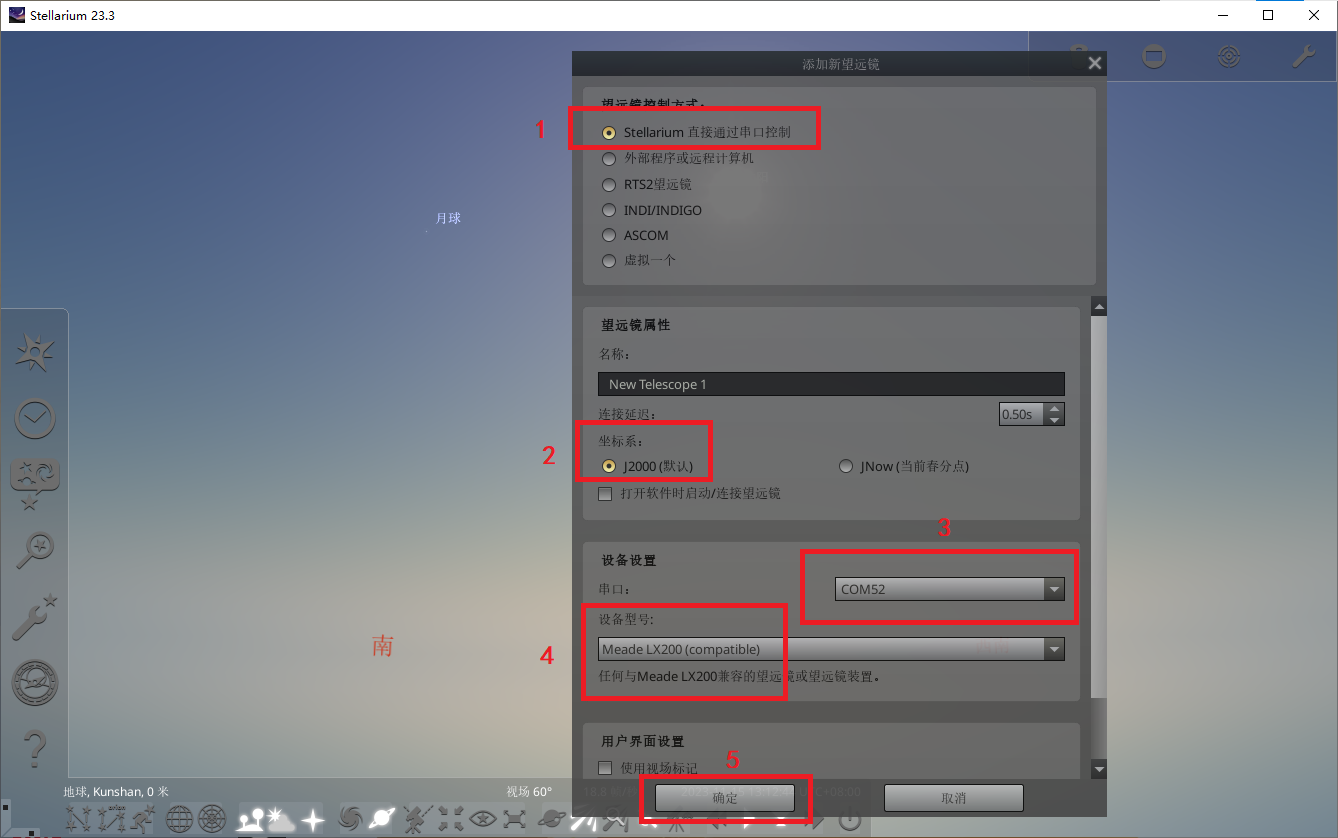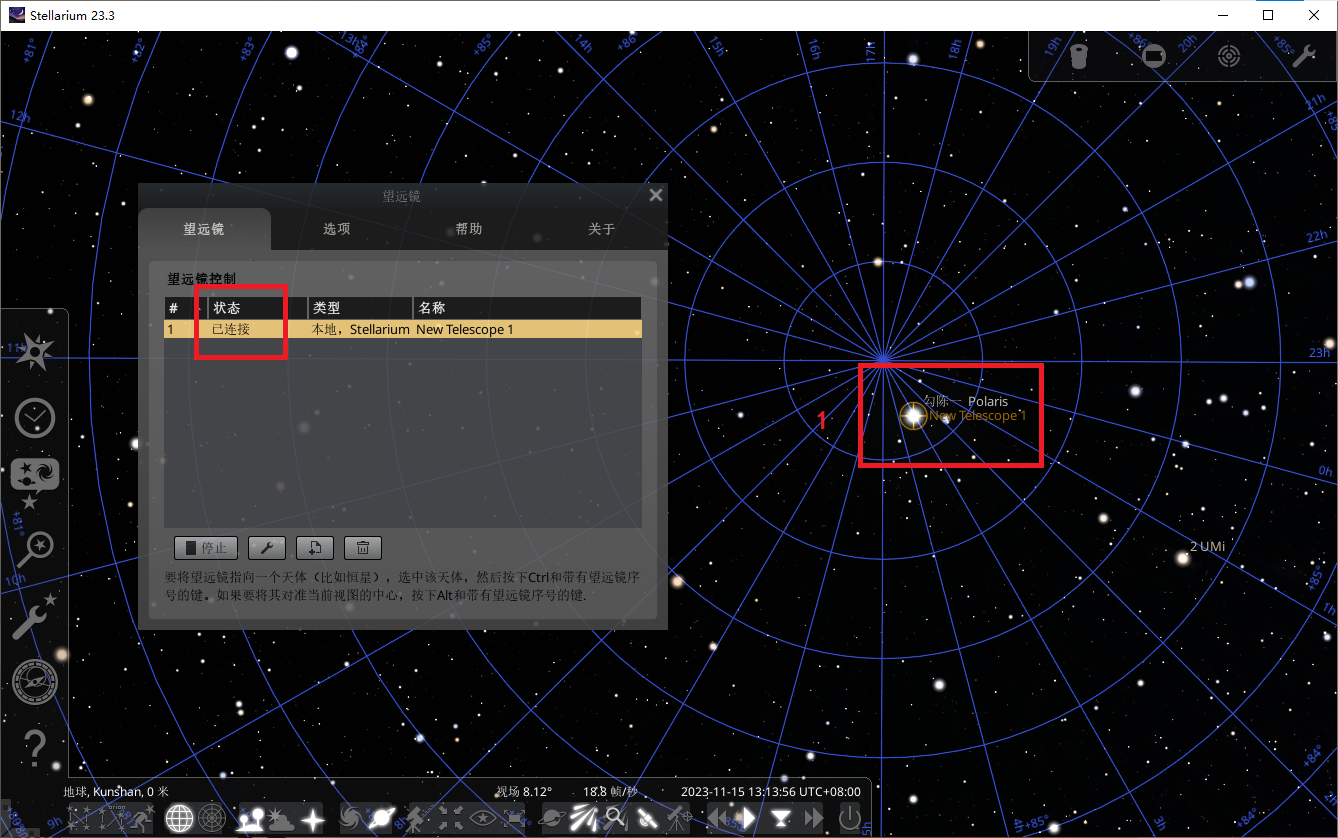 重启软件后,按照上图设置再次进入”望远镜控制“页面,并点击设置。