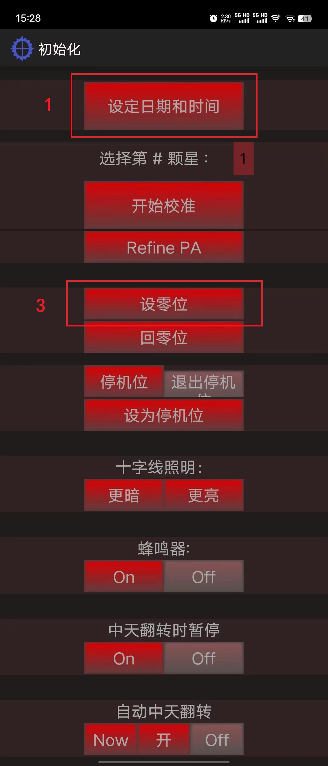 3.将望远镜目镜视场手动对准北极点(也可为北极星),点击设零位进行初始位置设定