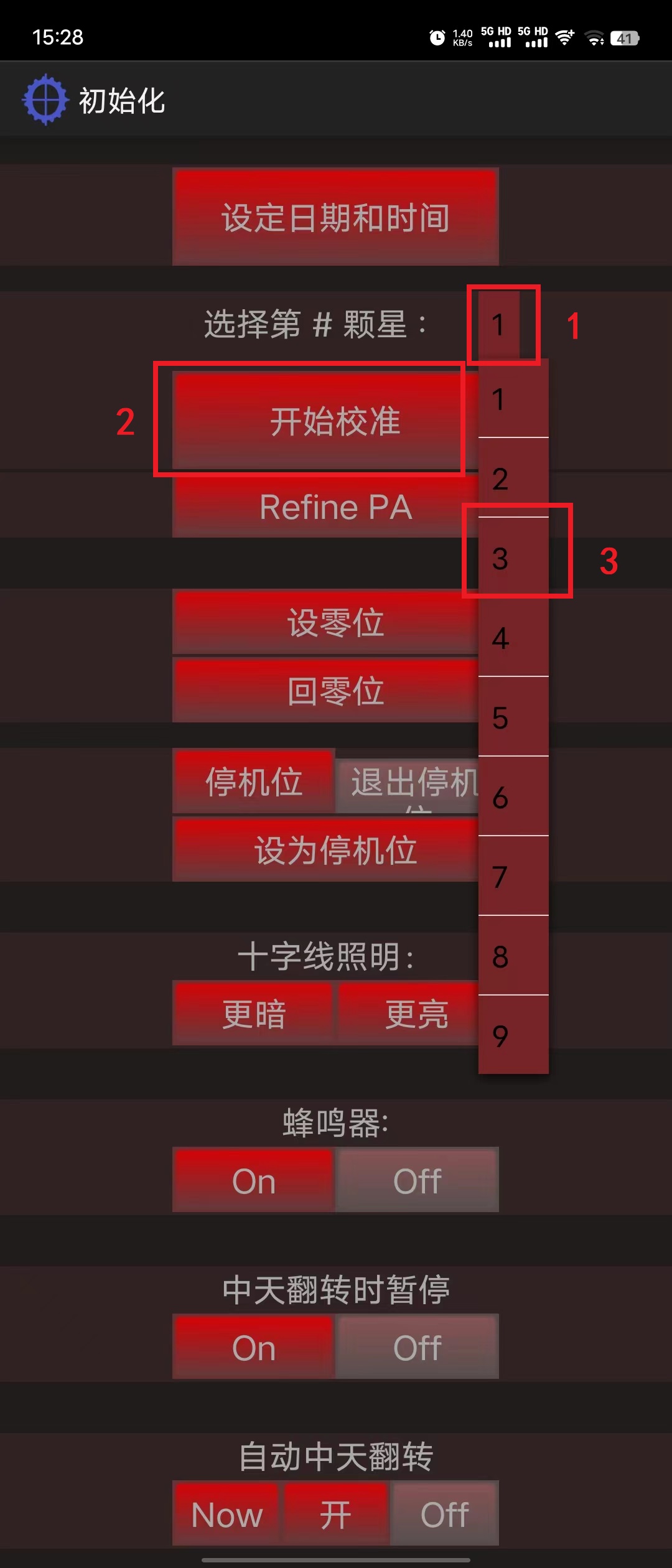 1.此处显示正在校准第几颗星,如图为第一颗,在下方列表中选择一颗来校准,可以对照星图来查看是哪一颗星。选择的星点应分布在各方位,不要集中在一起
