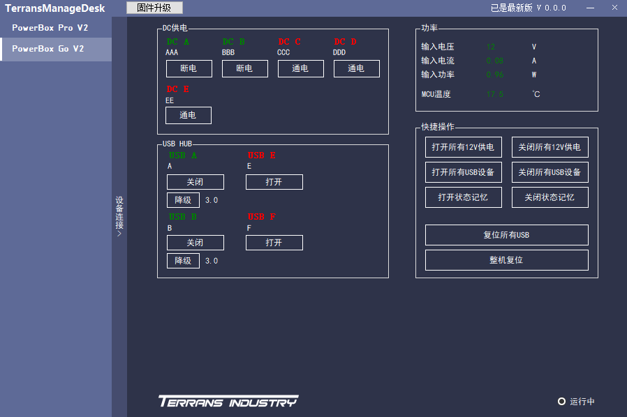 Terrans PowerBoxGo V2的每一个USB接口均支持独立控制远程插拔和供电开关,每个USB接口最大支持2A电流输出。在远程台中,当所连接的设备出现无响应或异常时,可以通过软件方便的对故障设备进行快速重置。